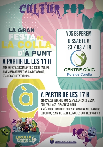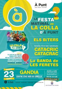 Aquestes activitats infantils són gratuïtes. El dissabte, 23 de març, d’11 a 20 hores tindrà lloc la Gran Festa de la Colla d’ À Punt. Es repartirà suc de taronja als assistents. A la vesprada, cançons, màgia, discoteca mòbil i xocolatada.