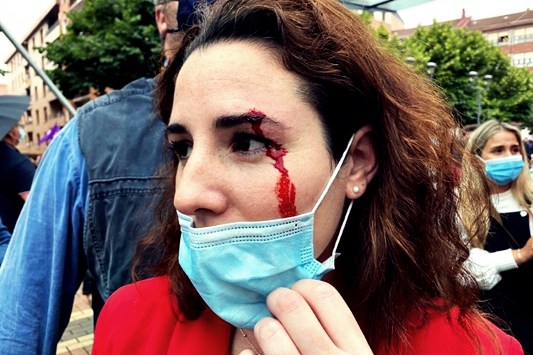 El presidente de Vox, Santiago Abascal, ha intervenido esta tarde en un mitin electoral en Sestao que se ha desarrollado entre cargas de los agentes antidisturbios de la Ertzaintza en respuesta a los lanzamientos de distintos objetos por parte de grupos antifascistas, uno de los cuales ha causado una brecha en la ceja a la diputada de este partido Rocío de Meer.
