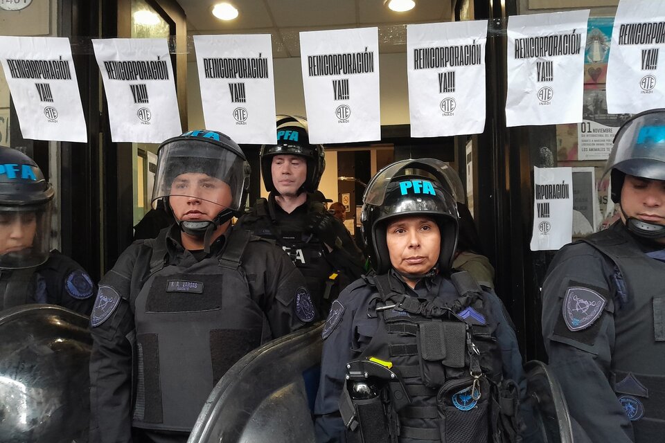 El nivel de tensión fue similar en el Inadi, el instituto cuyo cierre fue anunciado hace un mes por el gobierno. La policía no dejó ni siquiera que los trabajadores pudieran realizar la asamblea en la puerta del organismo. Hubo empujones y llamados al orden por parte de los agentes, que prohibieron los ingresos. La misma presión la ejercieron sobre la vereda.