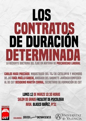 Bajo el título “Los contratos de duración determinada. La reciente doctrina del TJUE en materia de precariedad laboral” la CGT, en colaboración con Jueces